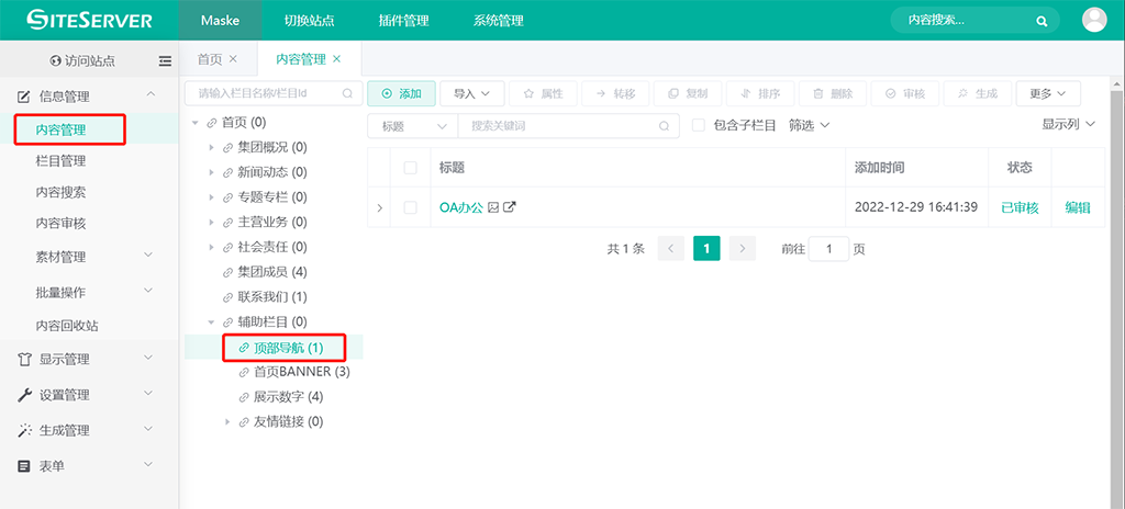 进入 SSCMS 后台 信息管理 -> 内容管理 界面,点击栏目 顶部导航,我们可以看到页面中展示的1条链接: