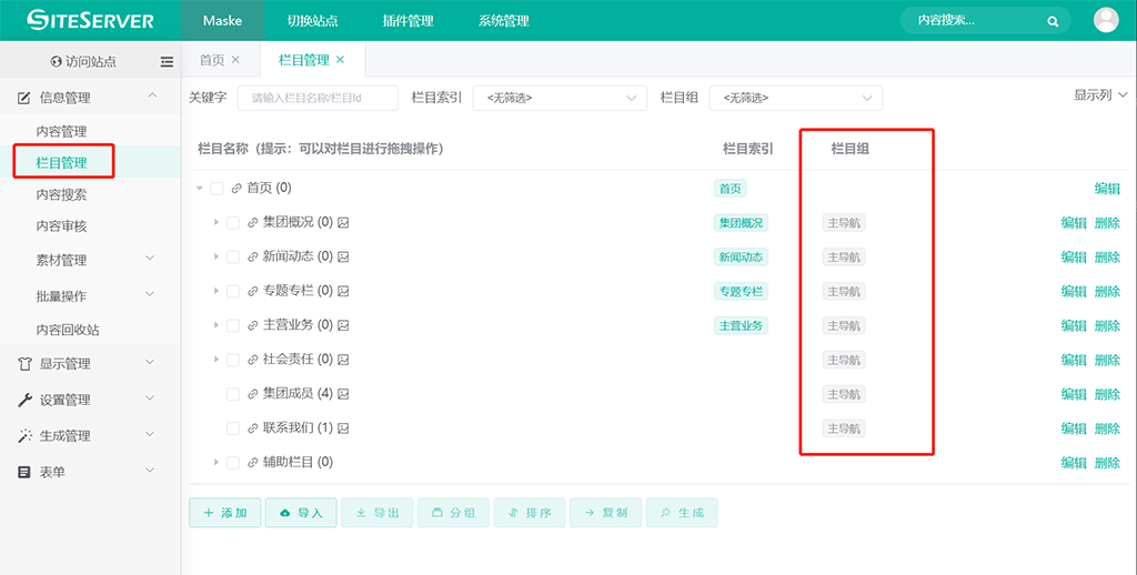 如果需要修改导航,请点击对应栏目右侧的 编辑 按钮,进入栏目编辑界面: