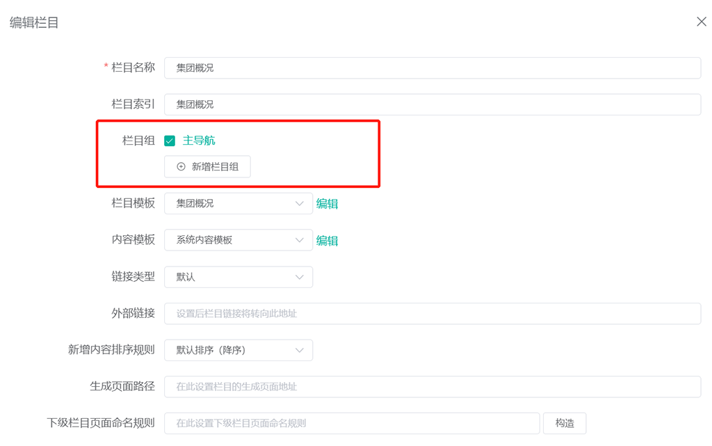 在此勾选或者取消勾选对应的栏目组,用以设置指定栏目是否显示在对应的导航中。