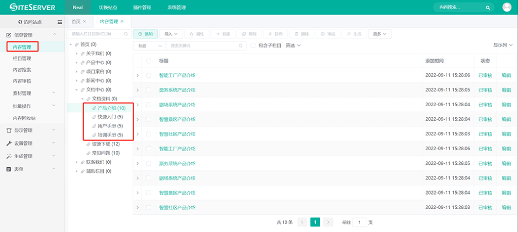 进入 SSCMS 后台 信息管理 -> 内容管理 界面,找到栏目 文档资料 的下级栏目: