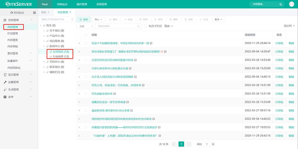 进入 SSCMS 后台 信息管理 -> 内容管理 界面,找到栏目 公司新闻 的下级栏目: