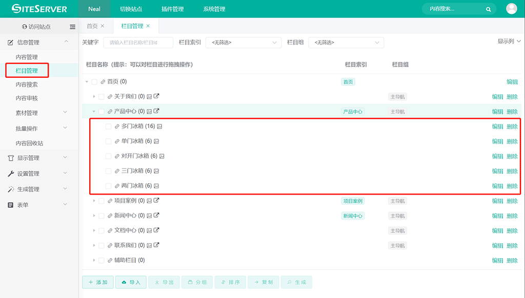 进入 SSCMS 后台 信息管理 -> 栏目管理 界面,找到栏目 产品中心 的下级栏目: