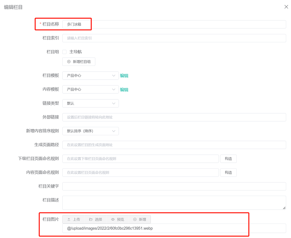 在此我们修改栏目名称以及栏目图片,首页产品中心切换部分图片及文件将跟随变化。