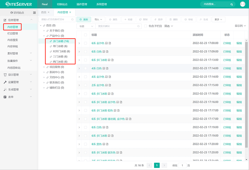 接下来进入 SSCMS 后台 信息管理 -> 内容管理 界面,进入栏目 产品中心 的下级栏目:
