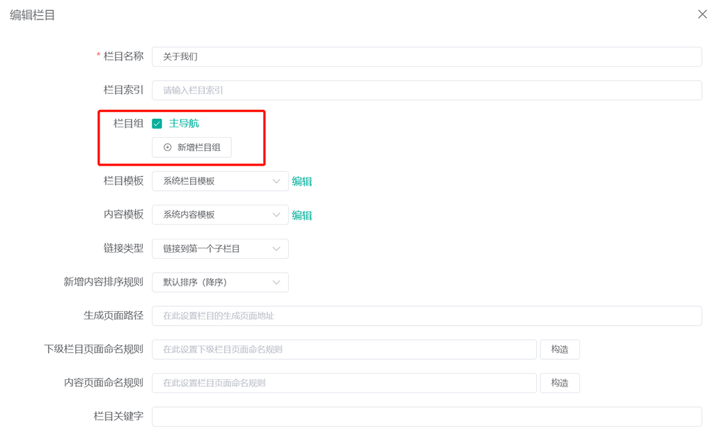 在此勾选或者取消勾选对应的栏目组,用以设置指定栏目是否显示在对应的导航中。
