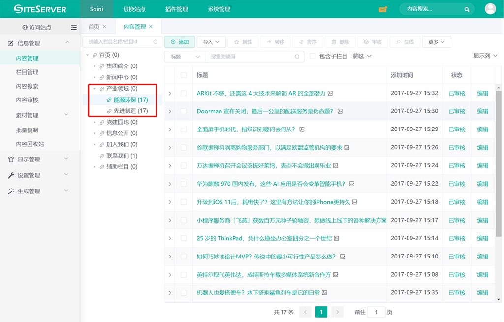 进入 SSCMS 后台 信息管理 -> 内容管理 界面,点击栏目 产业领域,我们可以看到党建园地有两个子栏目: