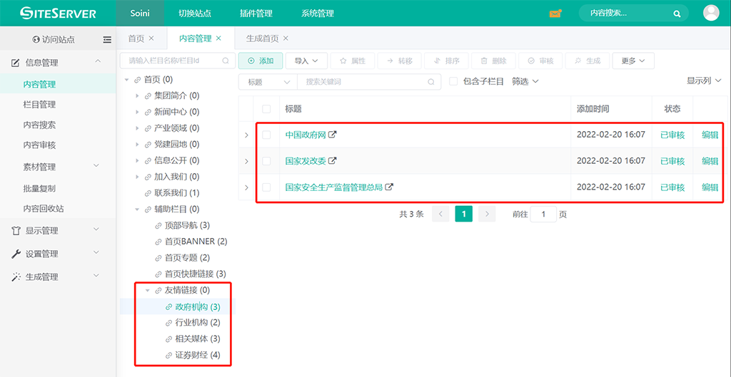 进入 SSCMS 后台 信息管理 -> 内容管理 ,点击栏目 友情链接,我们可以看到栏目下的内容: