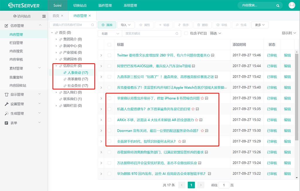 进入 SSCMS 后台 信息管理 -> 内容管理 界面,点击栏目 信息公开: