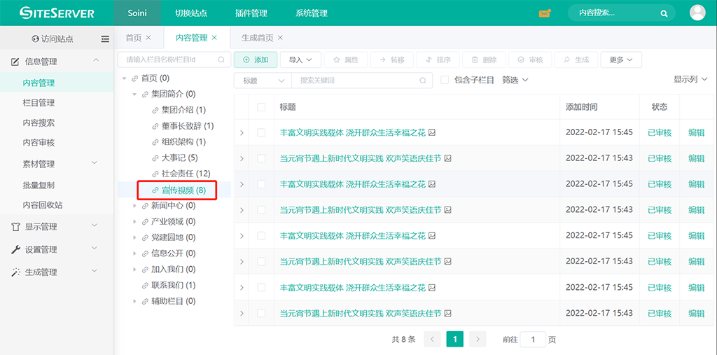进入 SSCMS 后台 信息管理 -> 内容管理 界面,点击栏目 宣传视频:
