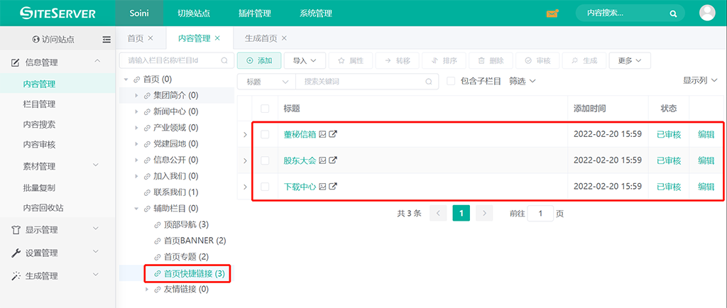 在首页宣传视频的下方设置了三个快捷链接,进入 SSCMS 后台 信息管理 -> 内容管理 界面,点击栏目 首页快捷链接: