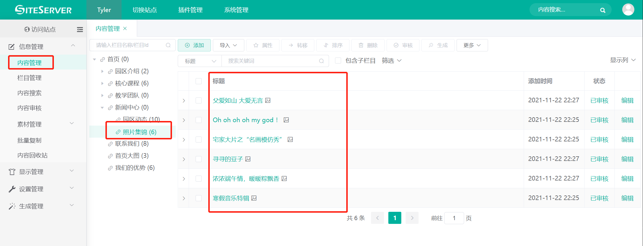 进入 SSCMS 后台 信息管理 -> 内容管理 ,点击栏目 新闻中心 -> 照片集锦,我们可以看到栏目下内容: