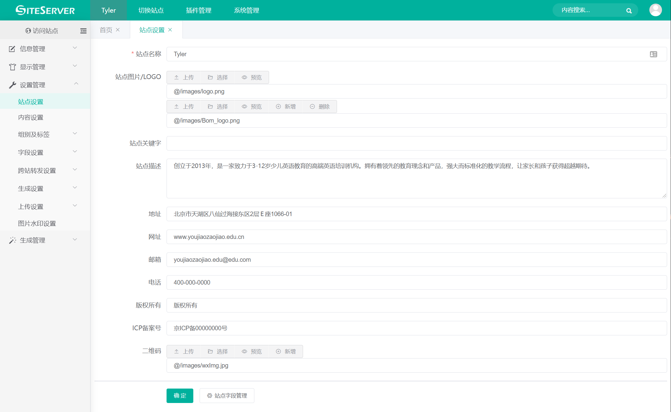 使用 Tyler 模板创建站点后,我们需要将站点名称、LOGO、电话、地址等信息替换为正式数据。