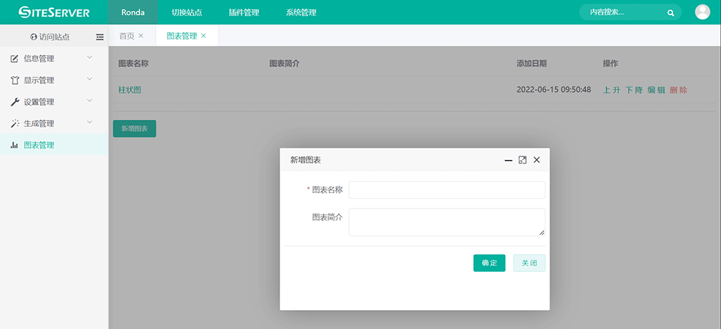 首先,在 SSCMS 管理界面中打开 图表管理 菜单,点击 新增图表 按钮: